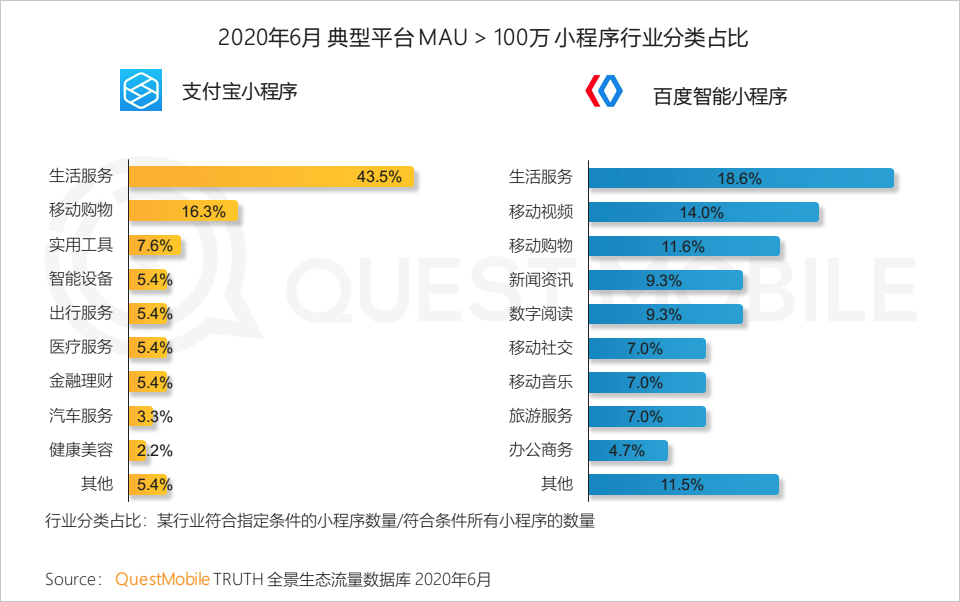 比如,支付宝的支付功能为大量服务型小程序提供了流量支持;而百度的搜索、信息流优势,则为视频、资讯、阅读等众多内容型小程序提供了流量入口。在月活用户大于100万的小程序行业分类占比中,支付宝小程序排名前三的是生活服务、移动购物、实用工具;而百度智能小程序排名靠前的则是生活服务、移动视频、移动购物、新闻资讯、数字阅读等。